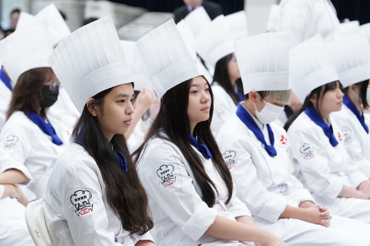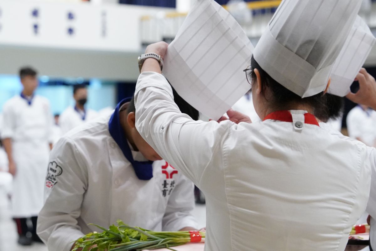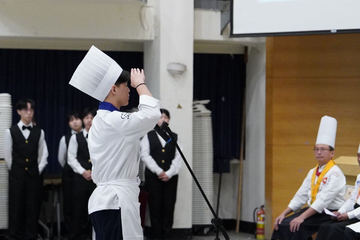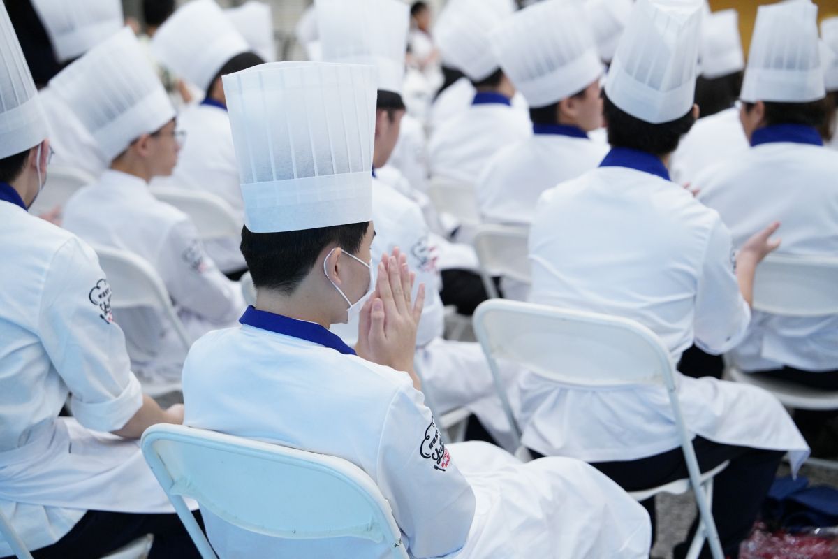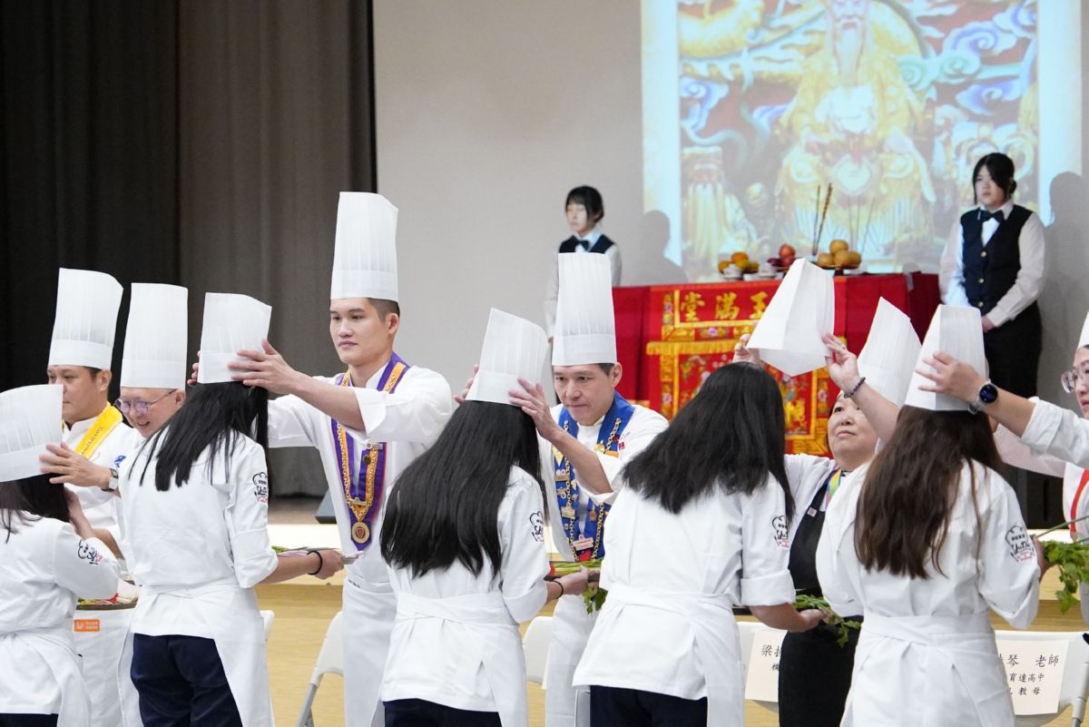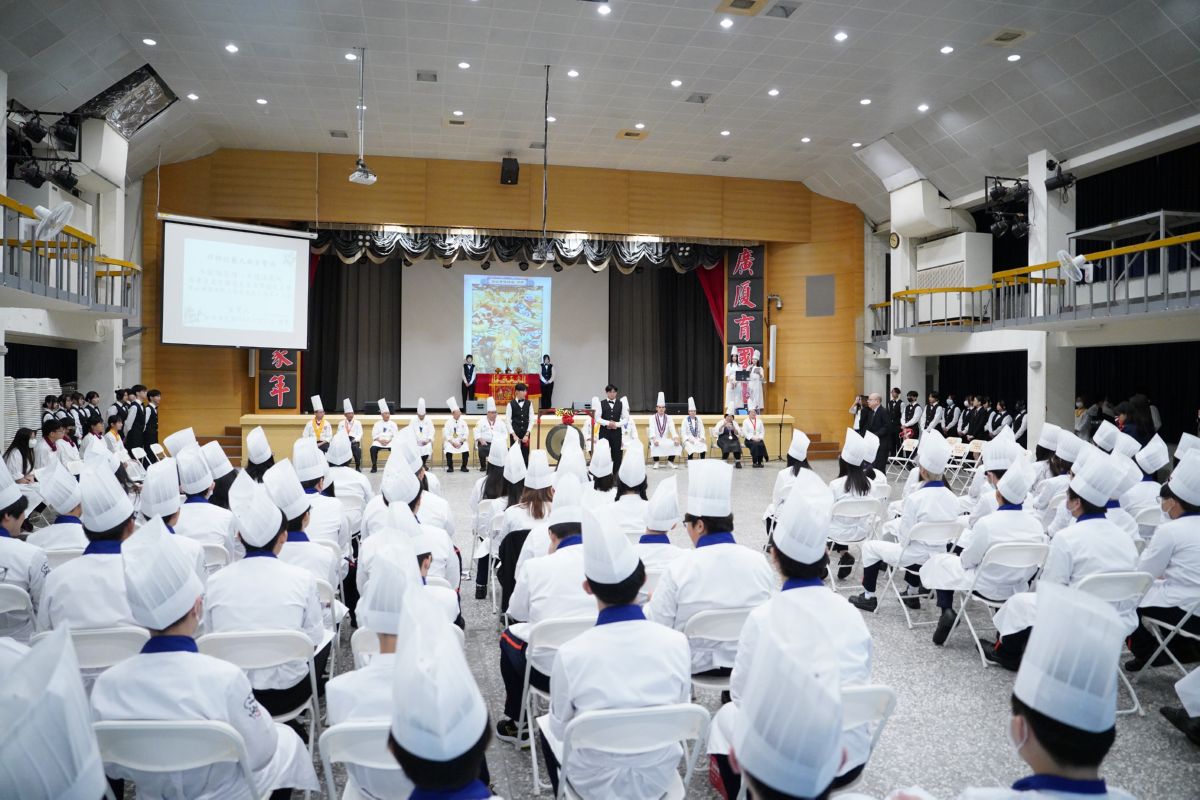 活動由主禮官劉美琪主任主持,帶領全體學生向餐飲祖師伊尹行祭禮,感念廚藝傳承之本源。隨後由一81班曾嗣漢同學代表宣誓,表達新生對廚藝學習的堅定決心。接續的「戴冠授藝」儀式中,本校餐飲科金牌主廚周振文師傅、麵包教母黃桂琴老師、異料高手鐘尤君老師,及來自業界的多位名廚共同為學生戴上象徵專業的廚師帽,並贈予寓意「聰明勤勉」的蔥與芹菜,象徵技藝傳承與勉勵新生精進不懈。