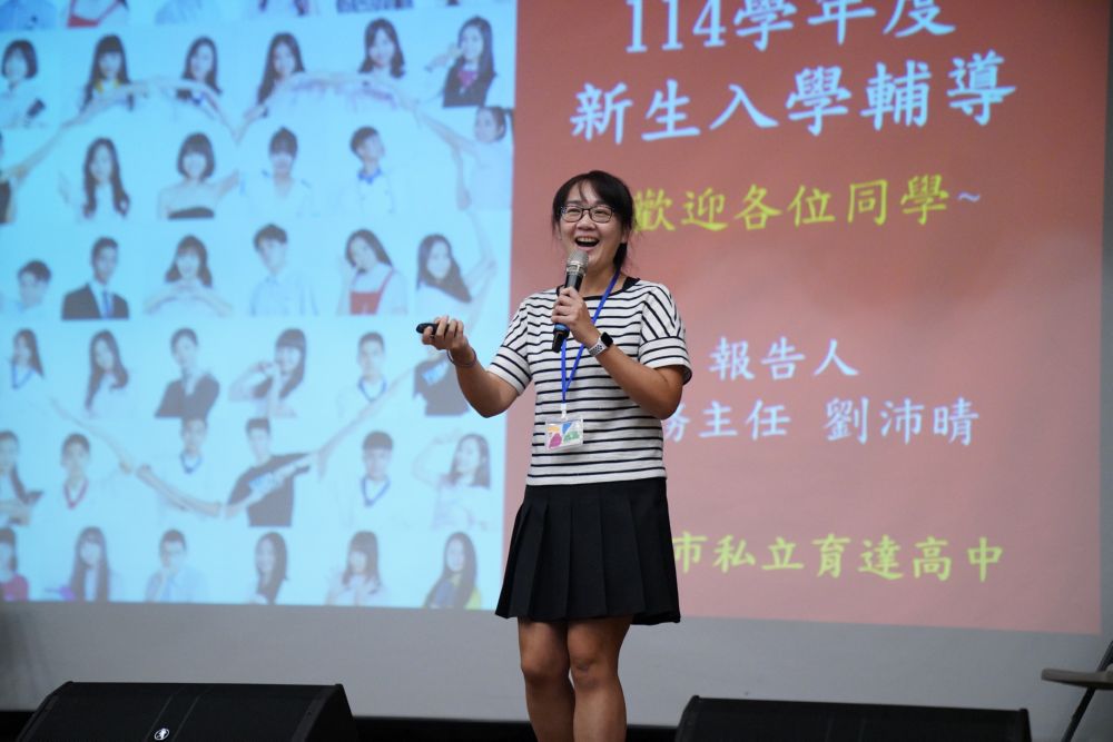劉育仨校長以幽默的綽號故事互動開場,並搭配有獎徵答活絡現場氣氛,讓學生在輕鬆氛圍中了解校名沿革、創辦人事蹟以及育達的大小事。他勉勵新生珍惜高中三年,勇敢追夢,秉持「快樂學習,成就自己」的精神,成為讓育達以之為榮的學生。
