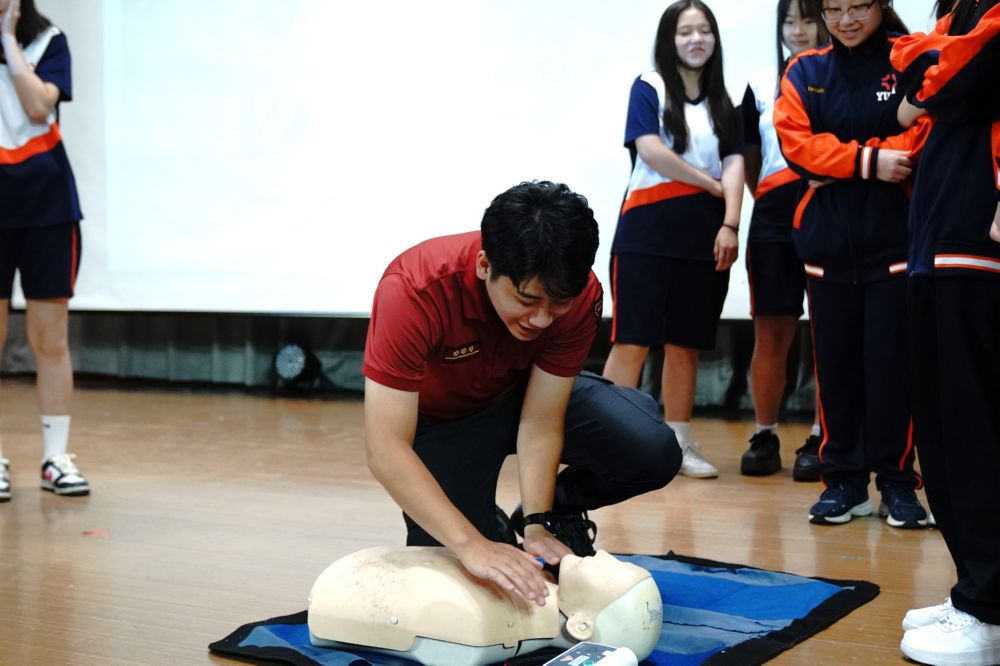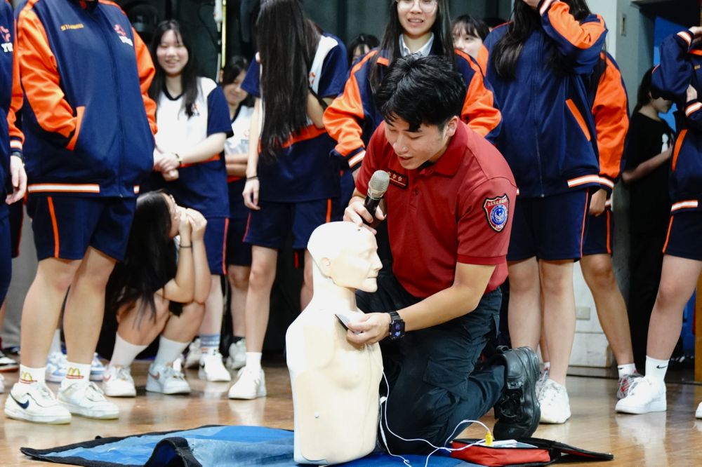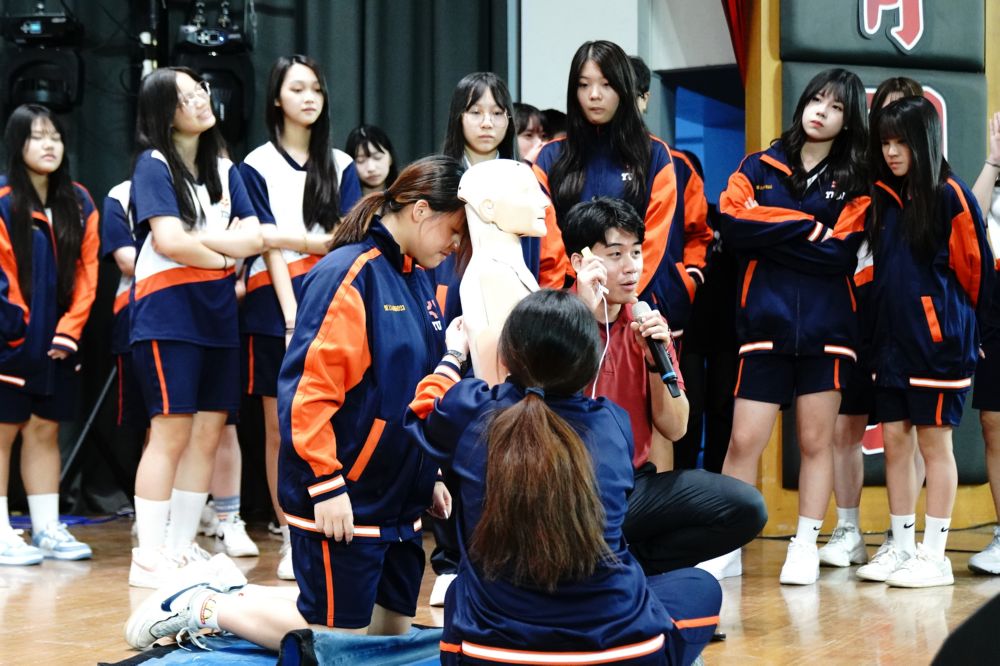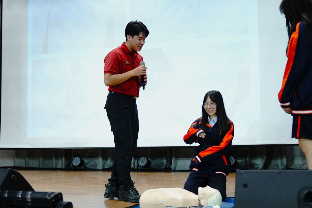 現場同時安排 CPR(心肺復甦術)與 AED(自動體外心臟去顫器)的操作教學。吳隊員逐步示範並邀請同學上台練習,讓學生在實作中學會正確技巧,增強臨場應變信心。學校期望透過此次活動,讓師生養成冷靜應對的習慣,提升危機意識與自救互助能力。面對不可預期的災害,唯有知識與行動並重,才能守護自身與他人的安全。