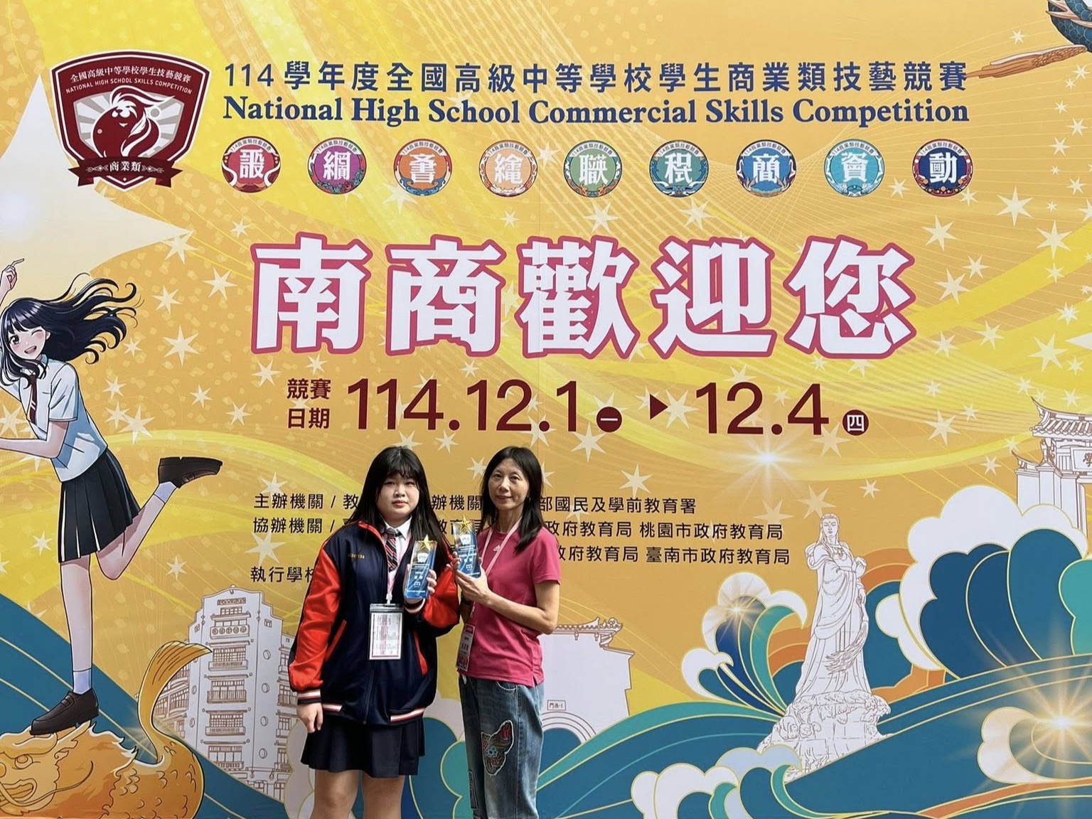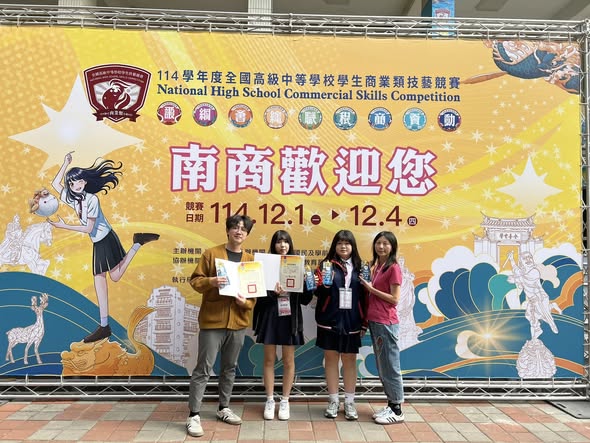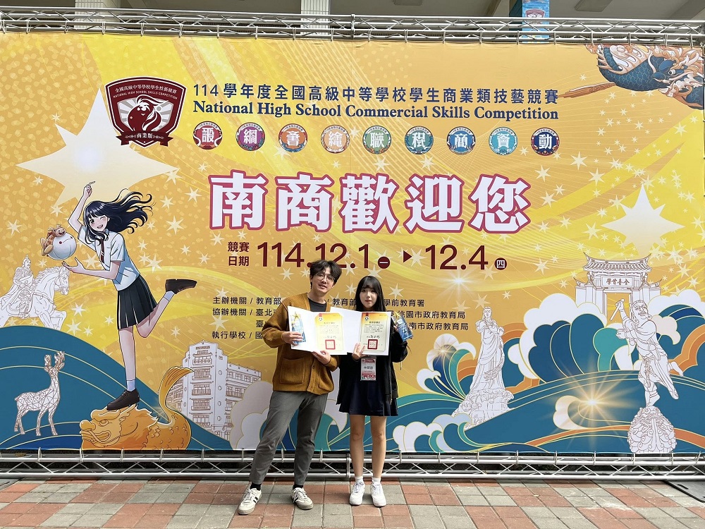 114學年度全國商業類學生技藝競賽於12月1日至4日在國立臺南高商舉行,集結全國 136 所高中職、519 名選手同場較勁,包含平面設計、網頁設計在內共九個競賽職種。今年主題「南得金手全制霸,商技少年占鰲頭」象徵全國菁英齊聚府城角逐金手獎,也展現技職教育與產業接軌的高度期待。在競爭激烈的全國賽中,臺北育達高中多媒體設計科表現十分亮眼。343 班林 O 容於平面設計職種獲得優勝,343 班鄭 O 涵於網頁設計職種獲得優勝,由莊翔宇老師、吳美慧老師指導。本次雙料優勝不僅展現學生專業能力,也再次證明多媒科在技職領域的穩健培育成果。