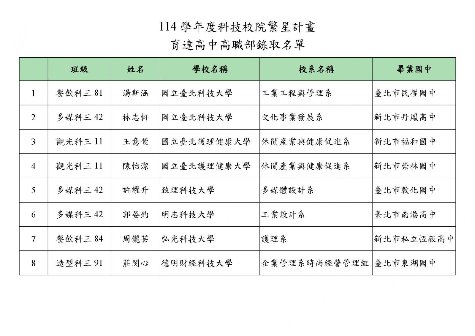 狂賀~本校114學年度科技校院繁星計畫(育達高中高職部)錄取名單