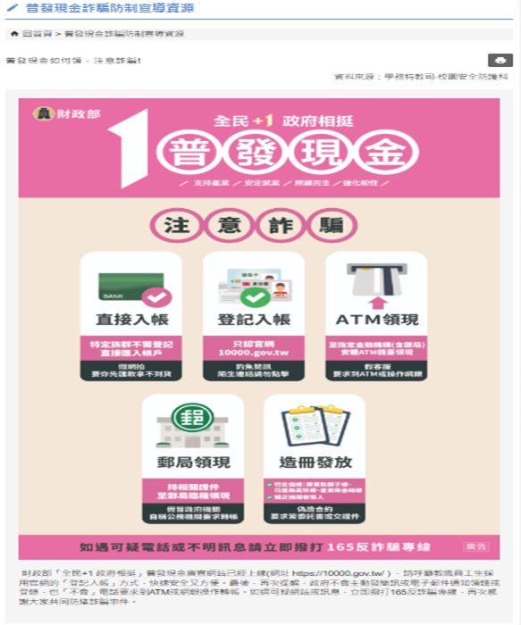 1、教育部建立「普發現金詐騙防制宣導資源」專區(網址:https://reurl.cc/qK8x8D),已納入財政部、內政部警政署、法務部、國家通訊傳播委員會製作之宣導品,防詐騙宣導網址如下: